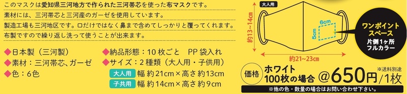当社でも地元である愛知県西尾市の帯芯屋さんとコラボして「ワンポイントマスク」を販売しております!!