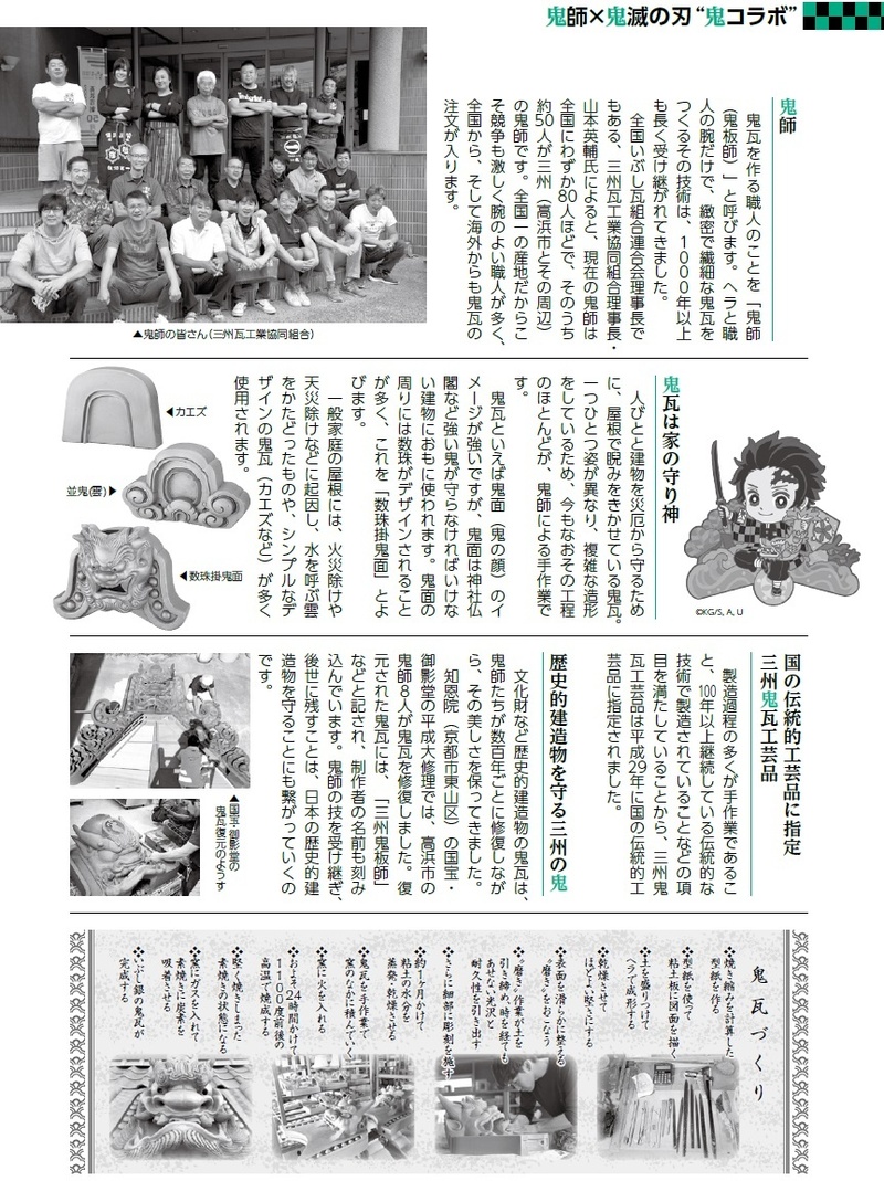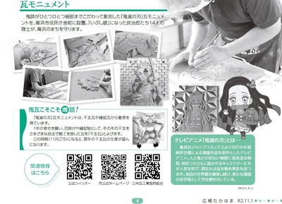高浜市広報の表紙でも鬼滅の主人公である炭治郎や、禰豆子らが鬼瓦と一緒に写っています。