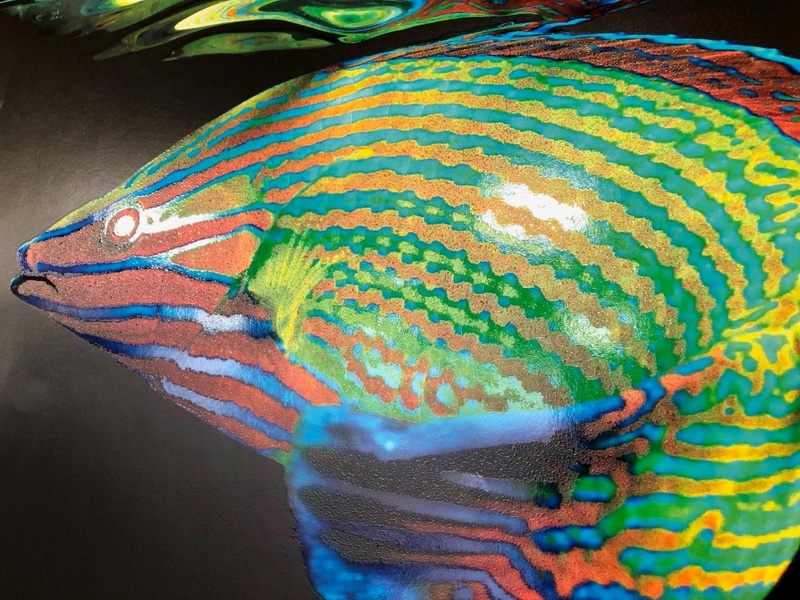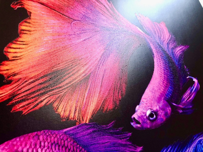 写真だとわかりずらいのが困っちゃいますが、よーくみていただくと、泳いでいる魚の模様を、擬似エンボス印刷の凹凸で鮮やかに表現しています!