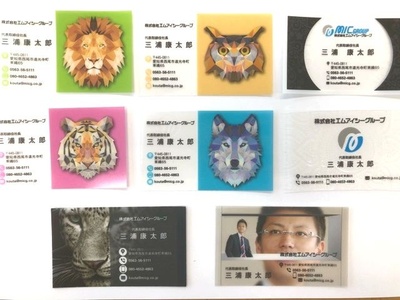 写真にある通り、展示会で配っている擬似エンボスクリアファイルと同じデザインや、自分の顔をあしらったデザインなど、今まで様々なデザインの擬似エンボスクリア名刺を作ってきました。