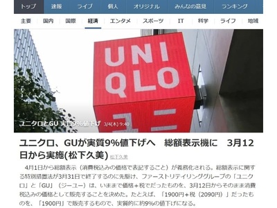 【今まで「本体価格+消費税」としていた商品価格を「本体価格(消費税含む)」に変更したことで、消費税分を実質的に値下げしましたよ!】というファーストリテーリング(ユニクロ、GUの運営企業)が神対応をしたというニュースでした。