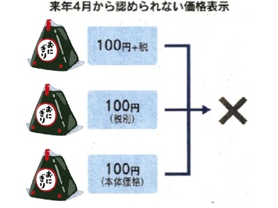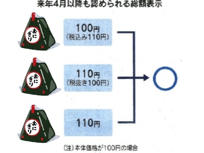 今後は、必ず本体価格+消費税で、税込で総額がいくらになるのかを表示しなければなりません。本体価格が100円であれば、「110円」という税込価格が必ずどこかに入っていていなければいけません。消費税を含む総額を、お客さんに分かりやすく表示しなければいけない義務をお店側は負うということです!