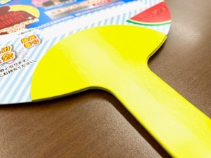 プラスチックの骨の表裏に、紙に印刷をした広告面を張り付けてうちわを完成させます。
