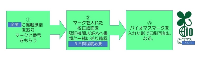 1:印刷物を依頼をする会社に、表示の承諾をもらいバイオマスインキマークと専用の番号をもらう