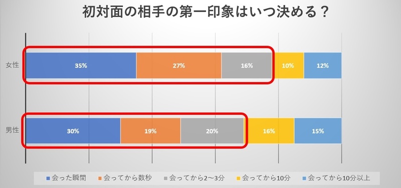 「会った瞬間」という人が男性で30%、女性で35%、「会ってから数秒」という人が男性で19%、女性で27%、「会ってから2~3分」という人が男性で20%、女性で16%という結果でした。