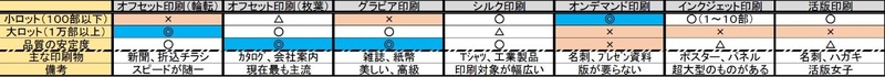 | ⑥インクジェット印刷 | オンデマンド印刷のサイズ大きいものというイメージ。ロール紙など専用紙で印刷されるため用紙種類がかなり少ない。1枚出力するのに数分から数十分と時間がかかる。数枚のポスター用途が多い。近年では屋外広告用、壁紙用に10m×10mなどかなり巨大なものも出てきたが、置き場の問題もあり |