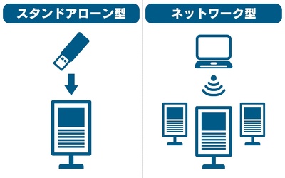 ディスプレイにそのままデータを取り込んでコンテンツを表示する方法です。USB等を使用するのでネットワークに繋げる必要がありません。初心者の方には比較的簡単にに導入できるためオススメです。