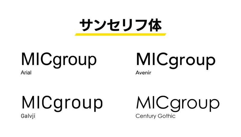 サンセリフ体は日本語のゴシック体に相当していて、横線と縦線の太さが均一になっていてウロコはありません。「サン」=「〜のない」という意味なので、サンセリフ体は「セリフがないフォント」ということになります。サンセリフ体は、シンプルなイメージ、親しみやすいカジュアルなデザインにしたい場合に使用するのがおすすめです。