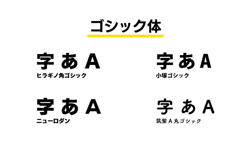ゴシック体は基本的にすべての線が同じ太さで表されるフォントです。明朝体とは違いウロコはありません。視認性が良いフォントなので、WEB・資料・ポスターなどの視認性重視の媒体・強調したい箇所に適しています。今もっとも使われているフォントはこのゴシック体です!