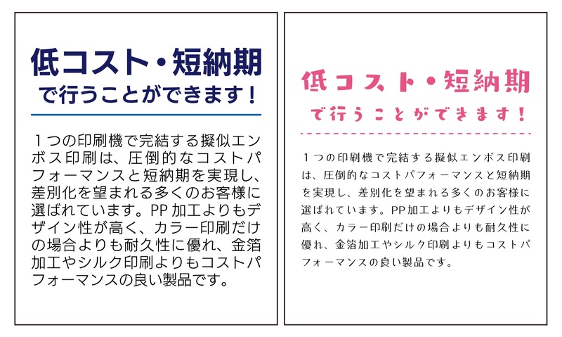 フォントによってデザインの印象が変わってきます。明朝体は引き締まった印象を与えるので、フォーマルな制作物でよく使われることが多いです。逆にゴシック体・丸ゴシック体はカジュアルな印象を与えることが多いです。またゴシック体は可読性◎なので使い勝手がいいですね。その他にもさまざまなデザイン書体などがありますので、各コンテンツで何を伝えたいのか、どのような雰囲気にしたいのかを意識してみましょう。