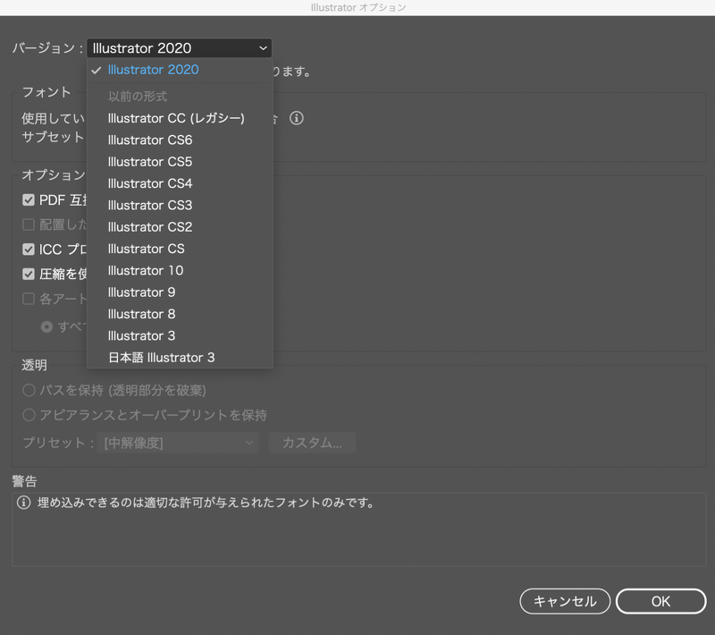 他の人へデータを送らなければならない場合などには、バージョンが違うとデータが上手く開かなかったりといったことが起こる可能性があります。もしそのような場合には保存時にバージョンを設定することができるので、相手のイラレのバージョンを確認しておきましょう。
