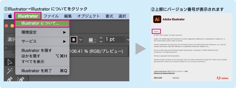 イラレのバージョンを確認するには、様々な方法がありますが、一番手っ取り早いのは、〈Illustratorについて〉を開いてバージョンを確認する方法でしょうか。