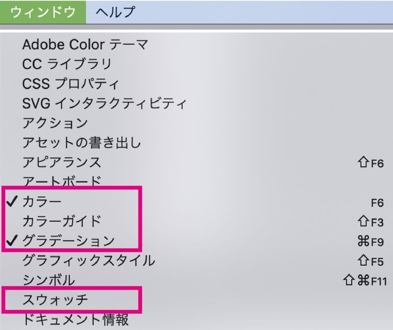 〈ウィンドウ〉→〈カラー〉〈スウォッチ〉〈グラデーション〉などのパレットで色を変更することができます。