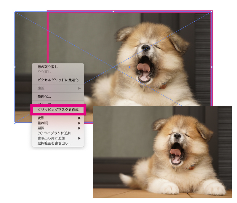②画像と枠を両方とも選択したら、右クリックで〈クリッピングマスクを作成〉を選択