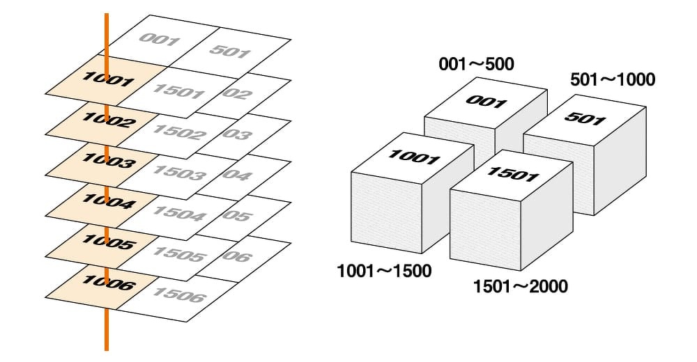ということです。串刺し印刷とは「断裁し重ねるだけで通し番号などの情報が連なった状態になる」ようにあらかじめ面付けするもので、例えば4面付けの場合普通に印刷すると左上が1、右上が2、左下が3、右下が4で2枚目の左上が5というように印刷されます。すると断裁後1枚1枚取っていく必要があり非常に手間のかかる作業となります。これを串刺し印刷にすると1枚目の左上が1、2枚目の左上が2、3枚目の左上が3という風に印刷されます。そうすることで、断裁後に数字が並んでいる状態になるため、後工程が非常にラクになります。(画像参照)これを編集ソフトで行うとなるとデータに対して並べ替えなどをする必要があり、少し頭を使います。