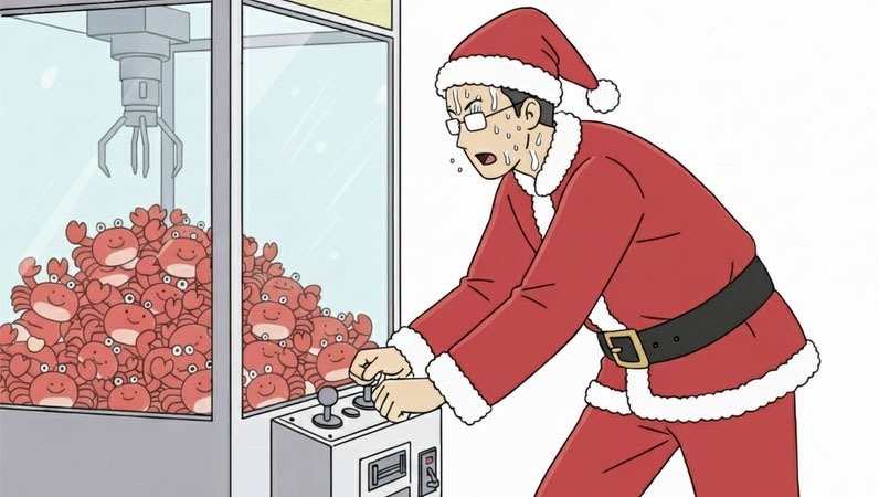 週末、サンタ(私)がゲームセンターで100円玉を積み上げ、脂汗をかきながら奮闘する未来が見えてきますが、いくらかかるかも分からないカニへの投資、、、