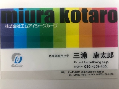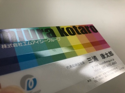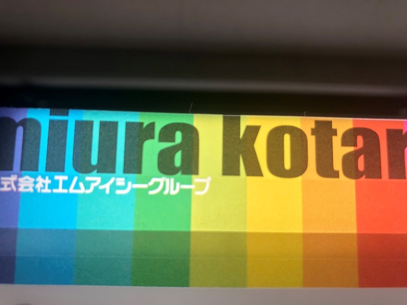 「miura kotaro」という私の名前で隠れてしまっている部分が<1>ツヤツヤ白なし、株式会社エムアイシーグループと書いてあるあたりが<2>ザラザラ白なし、その下がわかりずらいですが2段階に分かれていて<3>ツヤツヤ白あり<4>ザラザラ白なしです。
