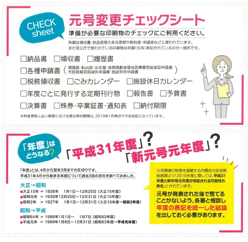 4月中には準備を進めておいて、5月に新元号に切り変わった際には、気持ちよく新しい元号の印刷物が出来るようにしたいですね!