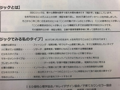 生年月日からの分類なので大したものではないかなと思っていましたが、意外と細かく、意外と当たっている!と感じた分類でした。組み合わせで100万通りの分類が出来るらしいです。