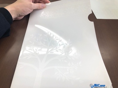 ニスによる擬似エンボスの模様はPPクリアファイルと同様にハッキリでてくれますので、当社の擬似エンボス印刷技術との相性は抜群のようです。
