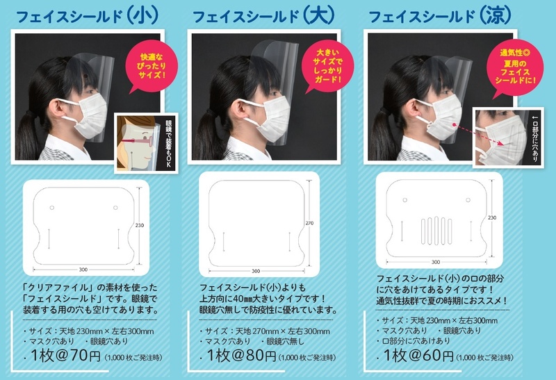 「フェイスシールド(小)」「フェイスシールド(大)」「フェイスシールド(涼)」の3種類です!