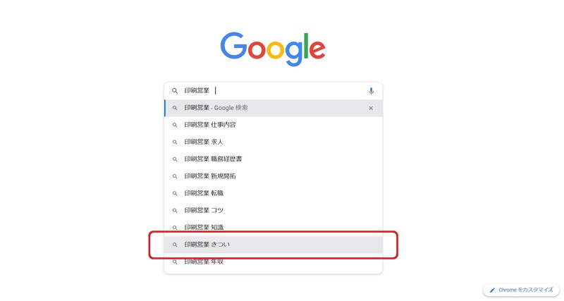 しかし、googlesさんの検索バーに「印刷営業」と打つと、衝撃を受けるサジェストを見つけてしまったのです。